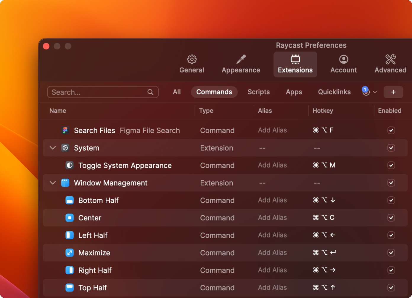 Most Commands in the Window Management are always helpful; Figma Files by Michael Schultz in the Store, and File Search by Raycast.