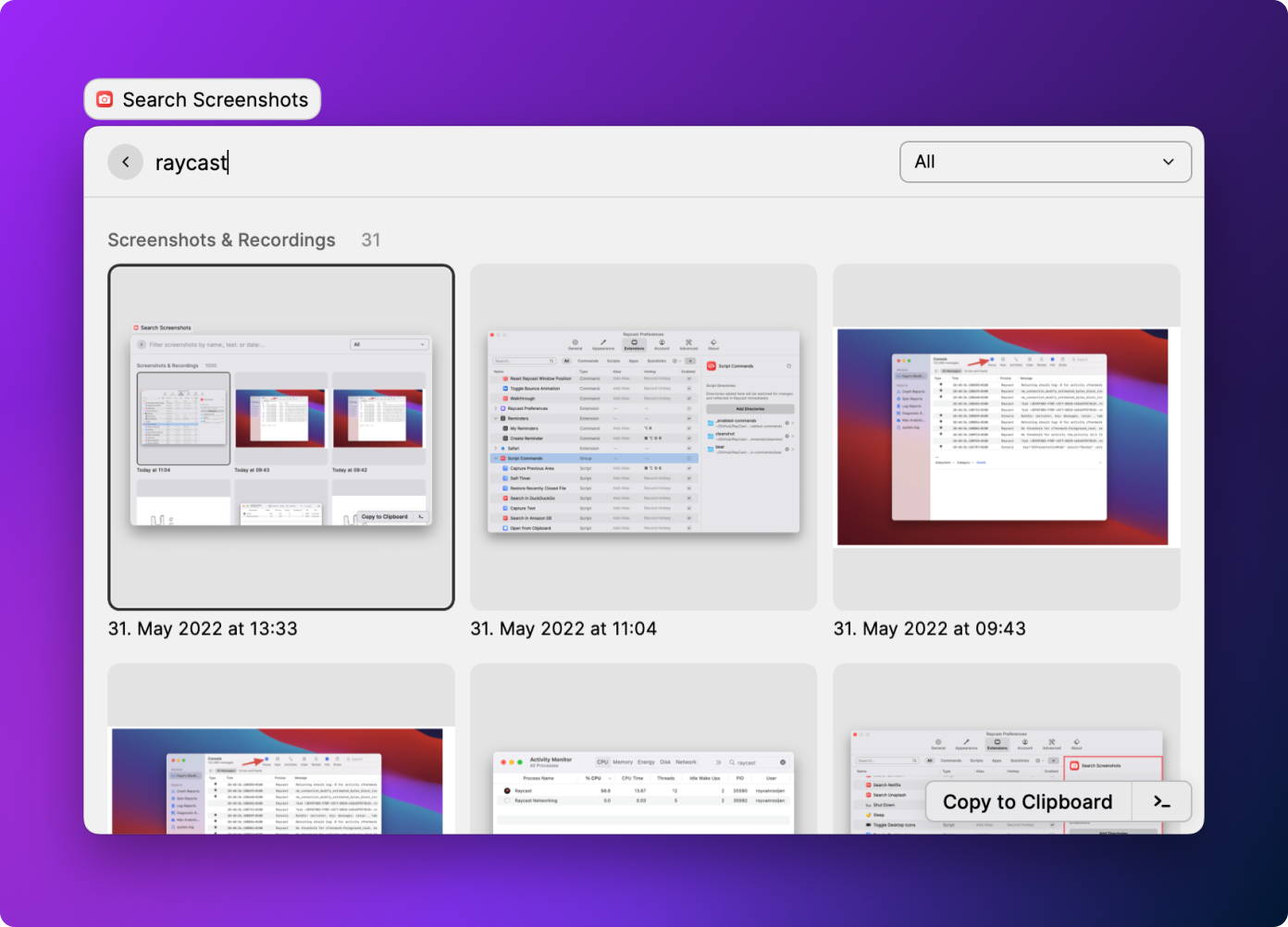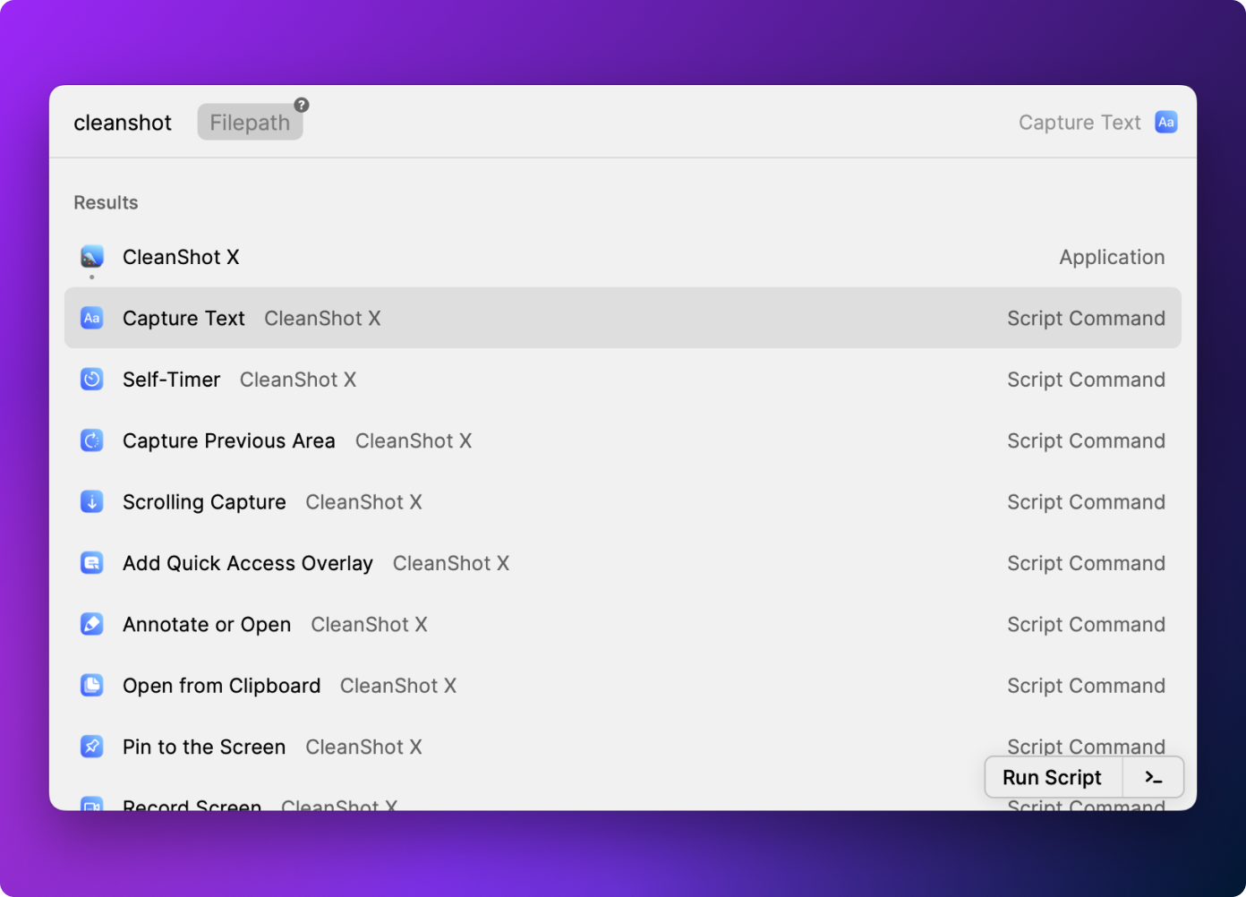 I’m the biggest user of CleanShot X. For the few types of actions I don’t have hotkeys for, I use Raycast: Self-Timer, Capture Text, Scrolling Capture, Capture Previous Area and Open from Clipboard.